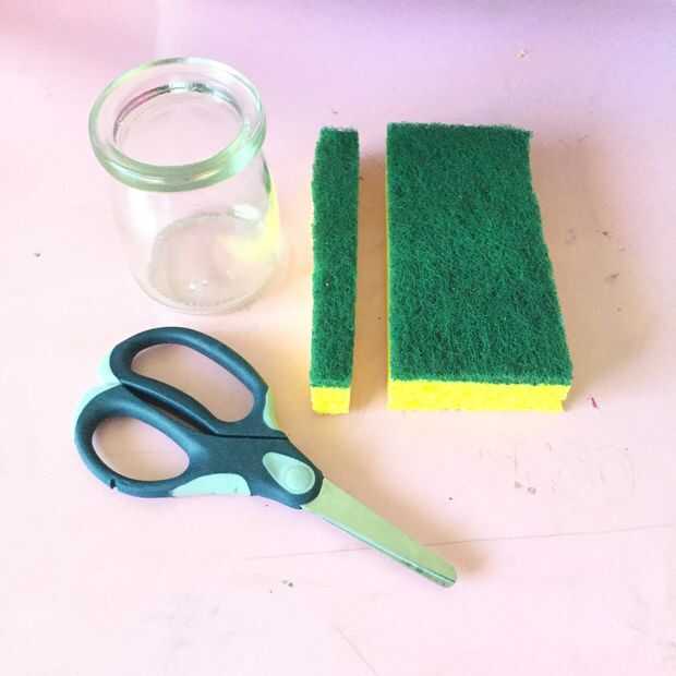 Obtener la esponja y corte por lo que cabe en el tarro. Guardar cualquier exceso de la esponja para uso más adelante.