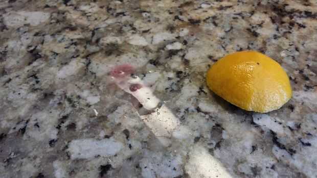 2. remoje la mancha en jugo de limón durante 10-15 minutos dependiendo de lo duros que su mancha es. Si la mancha no está en una superficie plana puede cinta o banda de goma el limón en rodajas a la superficie. Improvisar!
