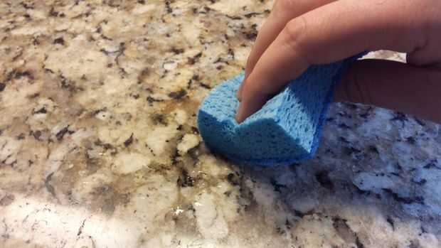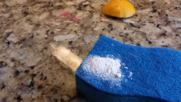 3. en el lado áspero de tu esponja espolvorear un poco de su bicarbonato de sodio y friegue la mancha. Con un poco de suerte la mancha debe venir justo al lado y debe tener un agradable olor a cítricos. De sangre o la sal de vino tinto es bueno añadir también.