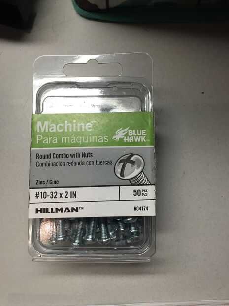4 pernos (USA #10-32 x 2" y tuvieron que perforar los orificios en el ventilador. Usted puede conseguir más pequeños si usted no desea utilizar un taladro)