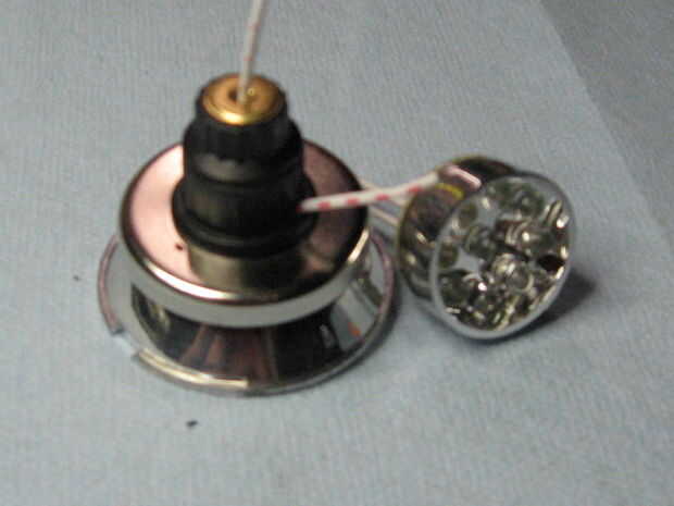 3. Tome la lente vieja y perfore un agujero (lo suficientemente grande para el plomo de alambre positivo) en algún lugar cerca del anillo de contacto metálico.