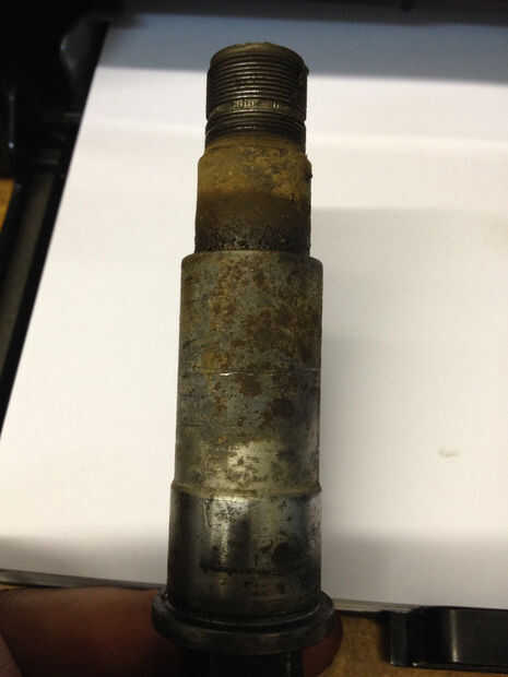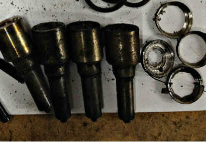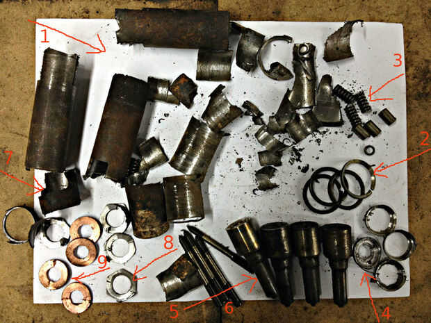 Inserte la boquilla del soplador de la línea aérea y aliviar cualquier piezas duras que pueden ser ahora gratis (pequeño resorte, Cañas y tapas) ahora debemos a una profundidad de 2.07"(52.8mm) algunas veces si somos central y suerte el taladro rompe el inyector carcasa [Shell] y la primera pieza [1] es gratis... Un anillo de seguridad se encuentra en el exterior del inyector a esta profundidad, por esta razón se despeguen. Ahora procedemos de acerca de. 5"(12,5 mm) debemos golpear un pedazo duro abajo. Pieza [4]