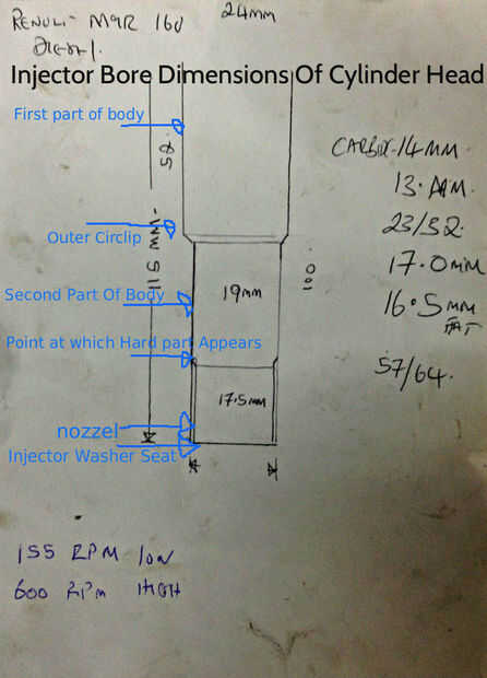 [Si la profundidad de la derecha ha logrado cuando localice el golpe y golpear con martillo este tap a través de y que libre la boquilla terca!. [5] y [4]. Si no se Taladro unos MM más profundo con broca y luego un poco más con el plano 16,5 MM broca... Trate de golpe a través de Nozzel otra vez. Después de haber quitado con éxito inyector, (soplo de la inyección principal del perno hacia fuera) pieza [6] ahora continuar con 23/32 (18mm taladro) [cuidadosamente!!!!!! -Comprobar como vas---4"(100MM) es ahora una profundidad crítica cuando llegue a esta profundidad ... Aquí tienes paciencia o un nuevo culata... Imagen [1] muestran una ilustración del inyector de diámetros y profundidad de la vivienda.