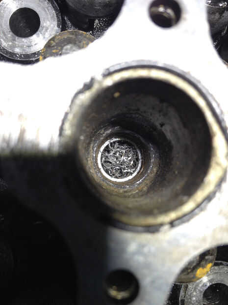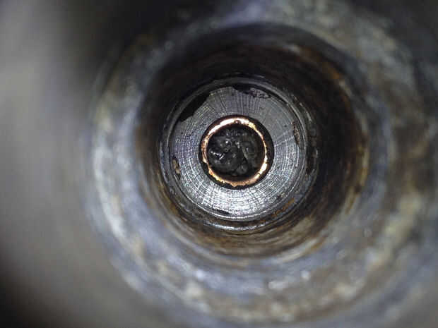 CEED a la etapa final que es crítico y Crucial para la eliminación exitosa de inyector - seguimos taladro con la broca de 16,5 mm [118/o] hasta que sienta una el taladro vibra---pare y compruebe regularmente - mediante iluminación si aparecer una forma hexagonal, luego estamos cerca de la lavadora de inyectores del asiento del inyector del [Image5]. Es elemento parada cuando usted puede ver la base de la lavadora. [8] - ahora pasemos a un ángulo de perforación Total ángulo plano es 175/o perfilar 16,5 mm taladro a este ángulo de otra manera se incumple el inyector de asiento. Aquí utilizamos la arandela de cobre por debajo nuestro guía a profundidad, es fácil ver... En este punto podemos ser afortunados, que el taladro se levanta este pedazo restante [imagen 7] o tenemos que ayudar en su camino, una vez más girando la cabeza hacia abajo y utilizando un punzón plano 5/16 para soltar arandela a través del orificio del nozzel de culata... Ver artículo [8-9]