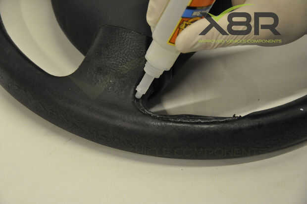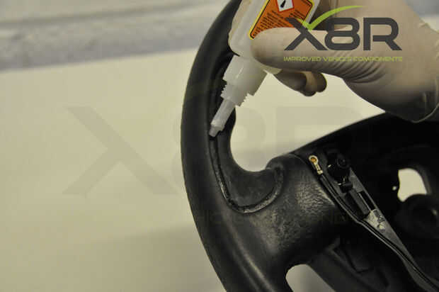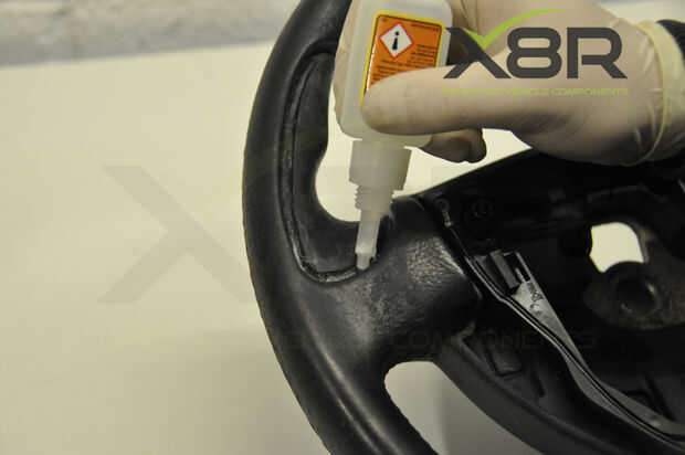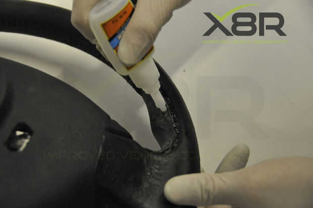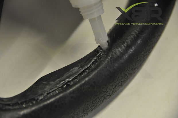 • Aplique pegamento en la ranura de la rueda de manejo, corriendo la cola todo el camino alrededor de la ranura y la parte central de donde se encuentra la empuñadura (como se muestra en las imágenes) - asegurarse de mantener lejos de la parte de cuero de la rueda de manejo.