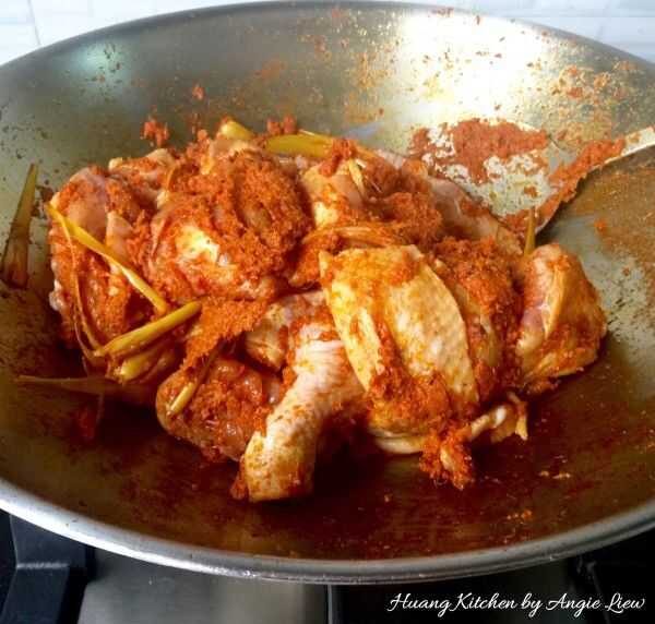 Revuelva freír el pollo con la pasta de especias aromáticas durante unos 10 minutos o hasta que la piel empiece a dorar un poco y el pollo ha estado bien cubiertas con la especia.