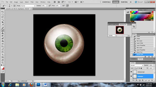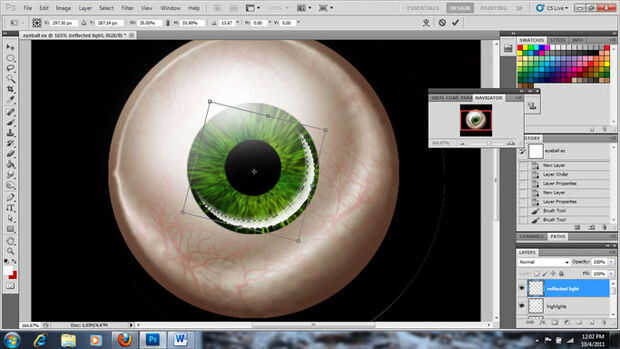 Otra copia de la media luna de pasta. La escala y gire para que esta reflexión se encuentra sólo en el interior el mismo fuera del globo ocular, otra vez en el lado que está en las sombras. Gire y tamaño la reflexión hasta que estés satisfecho con la apariencia. Combinar la capa abajo, para que ambas reflexiones están en la capa "luz reflejada". Defina la opacidad de la capa a alrededor del 70%.