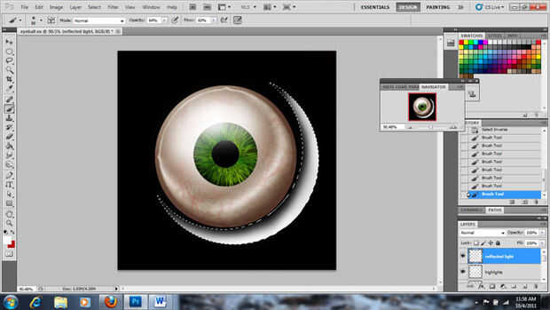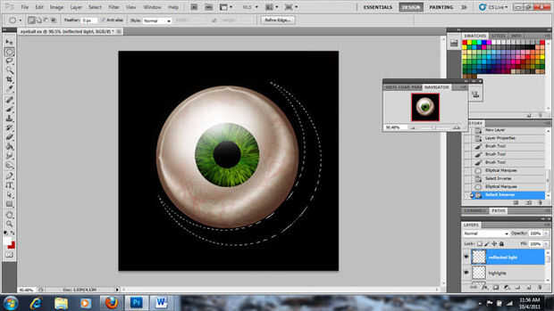 En la capa "luz reflejada" Seleccione un círculo grande (más grande que el ojo entero está muy bien). Invierta la selección (shift + comando + I). Mantenga presionada la tecla Mayús y seleccione otro círculo más pequeño, arriba y a la izquierda del círculo más grande. Los dos círculos deben superponerse para darle forma de media luna. Ahora invierta la selección otra vez, y debe tener sólo una forma crescent seleccionada. Con tu aerógrafo blanco, pintar el borde exterior de la Media Luna blanca. Copiar la selección. Ahora transformar la selección para que la media luna en forma de reflexión se encuentra justo en el borde del iris. Gire la media luna que está en el lado opuesto de la luz directa.