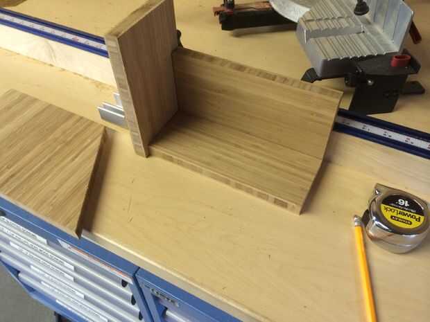 En una misión anterior había ya medí el ancho del borde de mesa de tejo, por lo que solo necesitaba una suspensión de aproximadamente 1-3/8" y una caja lo suficientemente grande como para sostener unas pintas.