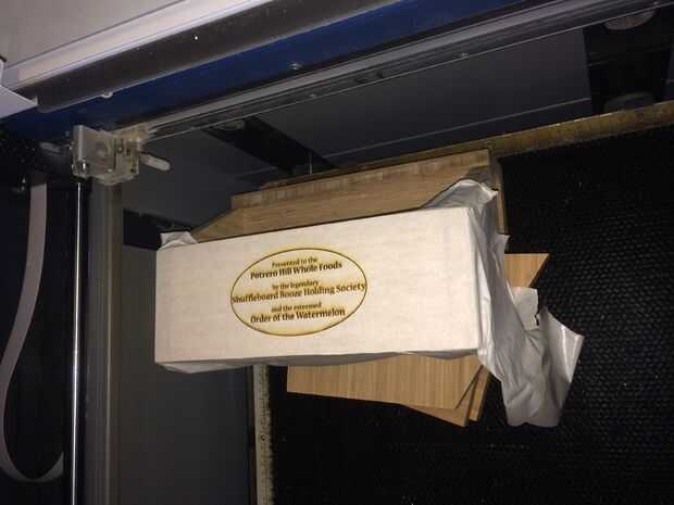 Para empujar las cosas un poco más, me decidí a personalizar esta caja con una dedicación de grabado a láser para el Potrero Hill Whole Foods. Uno de mis amigos y yo una variante de ejercicios llamada "Sandía", por lo que también podría lanzar también una referencia a que en y ver si nadie presta atención. (alerta de spoiler: no se presta atención)