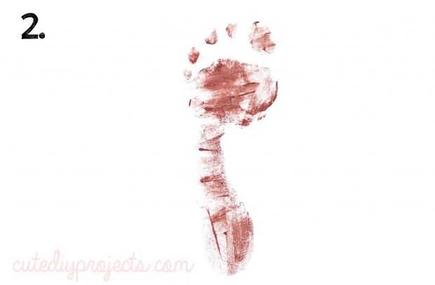 Después de aplicar la pintura, todo lo que tienes que hacer es presionar suavemente sus pies contra el papel, para que se crean dos huellas perfectos – estas impresiones serán los cuerpos de sus renos.