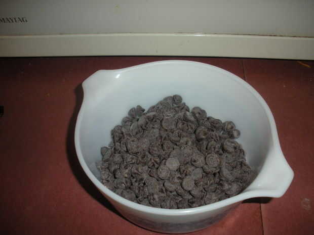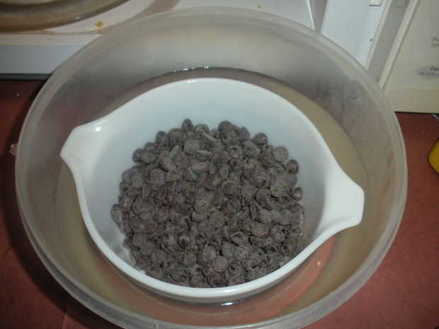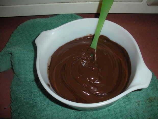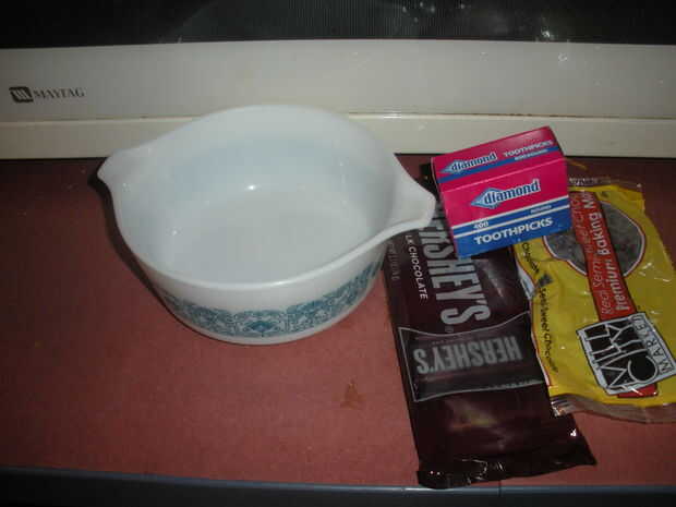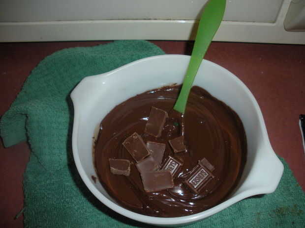 I poner aproximadamente una y media bolsas de chips de chocolate en un cuenco y sentó eso tazón de fuente en un recipiente con agua y cocinados en el microondas hasta que el agua estaba hirviendo. Luego de agitar el chocolate hasta que es liso y microondas agaion durante 45 segundos antes de revolver en chocolate oscuro 6 hersey pequeños bares uno por uno hasta que se derritieron.