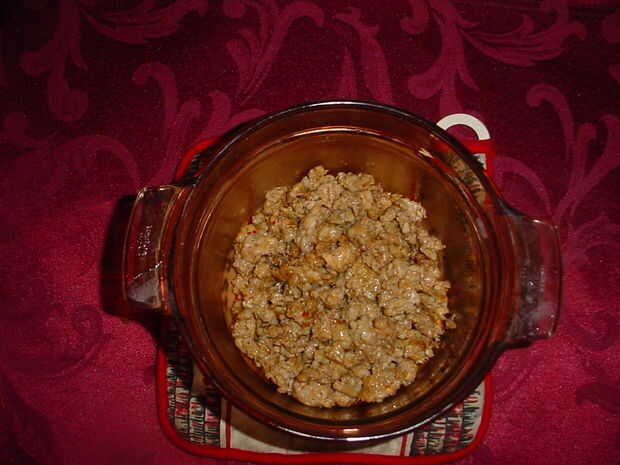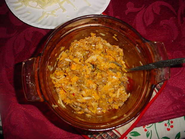 Tu salchicha no es color de rosa pero no profundamente dorada retirar de la sartén y deje que se enfríe. Agregar en el relleno de elección (Im usar doritos triturados finamente, pero usted podría utilizar las migas de pan o galletas machacadas) añadir el queso rallado (o desmenuzado), añadir un huevo ligeramente batido y revolver la mezcla para combinar