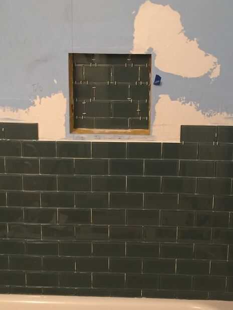 • No azulejo estante empotrado hasta el azulejo de la pared alcanza el mismo nivel. Esto le permitirá a las líneas de lechada para una línea continua.