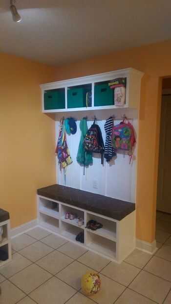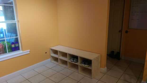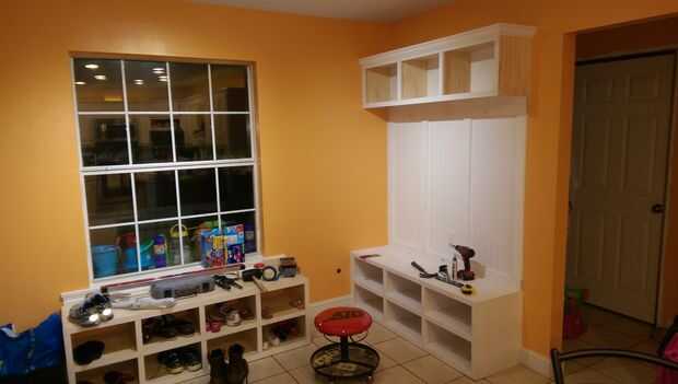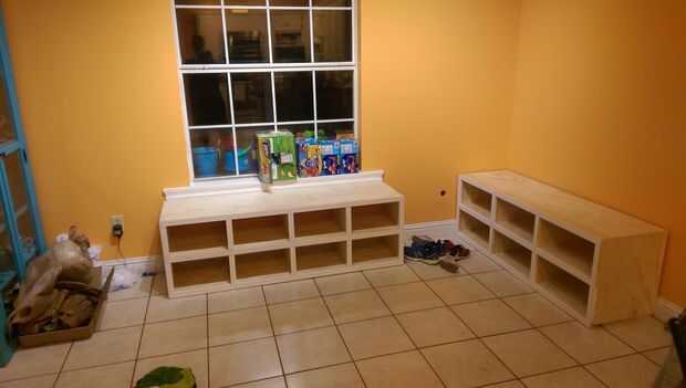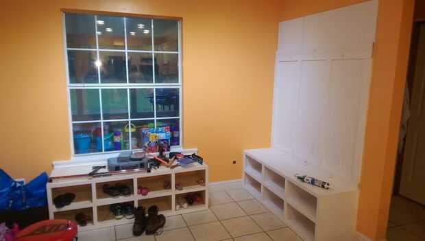 Consideramos esta parte de nuestra cocina un poco fuera de lugar. Obviamente es para una mesa y sillas, pero ya tenemos un comedor y un desayunador de península a sentarse y comer justo en la cocina. Es justo por la puerta de la cochera, así que pensé "¿por qué no poner un banco y algunas cubbies para todos 1000 pares de zapatos en nuestra casa?" Excelente almacenamiento.