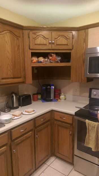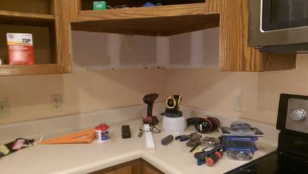 También llevó a cabo la campana de ventilación y poner en un nuevo microondas sobre la estufa. Una vez más, tuvo que modificar los gabinetes para ajuste bien. Afortunadamente la anchura era de un tamaño estándar para el microondas.