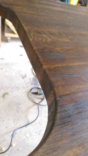 Manchado con manchas minwax regular y luego poner literalmente 5 capas de clara - "polycrylic" Lea las instrucciones - no se comporta como poliuretano normal. No se descolorará y limpia con agua. No huele bien. Se seca a cristalinas. Se ha instalado hace unos 6 meses, y mantiene muy bien. Nunca he puesto ninguna materia caliente directamente en él, se hace cero si arrastra algo agudo a través de él, pero nos hemos ajustado bien, y yo diría que es muy durable. El único inconveniente... si dejas agua estancada en él (como durante la noche), que se come hasta el final. Fuimos con este material para que cada par de años, sería el mantenimiento de la arena y secado de la parte superior. No aceite mineral como tapas de madera la mayoría porque no cuidamos como una tabla de cortar (categoría alimenticia) y también quería ser capaz de desinfectar eficazmente con una toallita clorox.