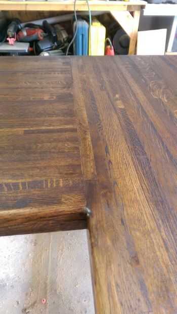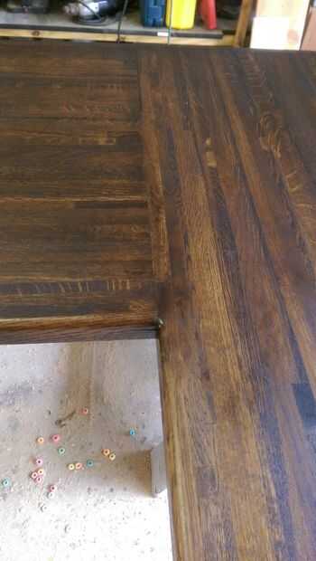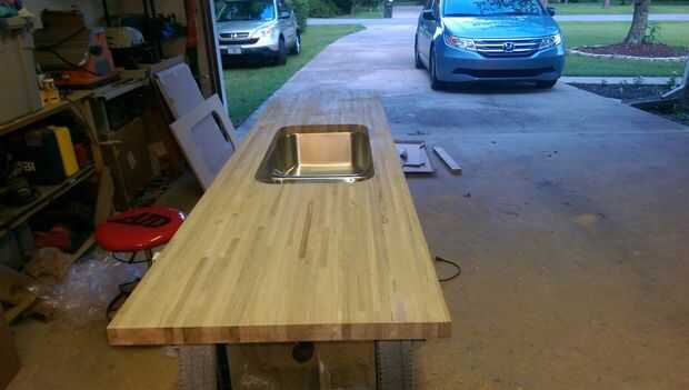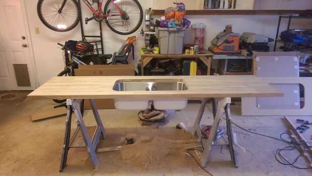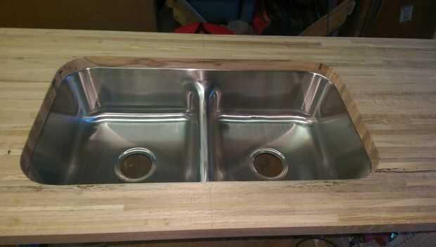 A los contadores. Me mide cerca de 12 veces para la ubicación de este fregadero (no te olvides del agujero del grifo demasiado), porque no hay marcha atrás una vez que el orificio está cortado. Por suerte salió muy bien. Para las dos juntas, usé un unidor de galletas, combinado con pocket tornillos y pegamento de madera de calidad. Funcionó hacia fuera a la perfección.