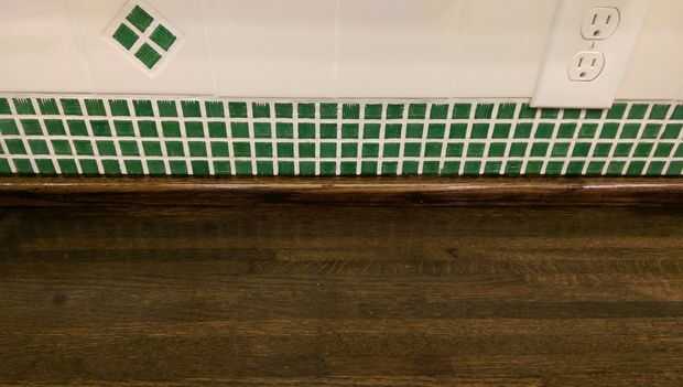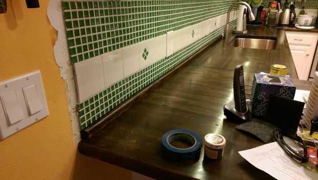 Para la transición de la baldosa al contador de madera, compró una tira de 1 x 2 de madera en The home depot y describen a continuación para que quepa bien entre la fila inferior de azulejos y el contador. Vino hacia fuera muy bien.