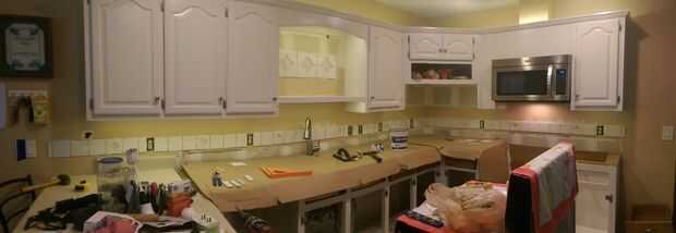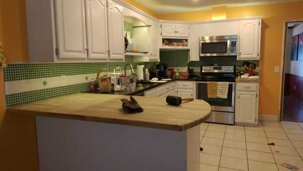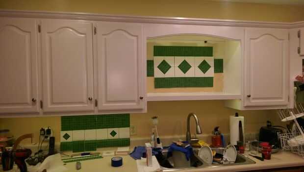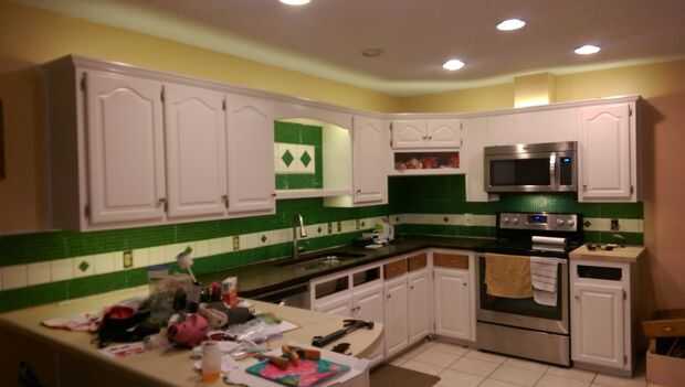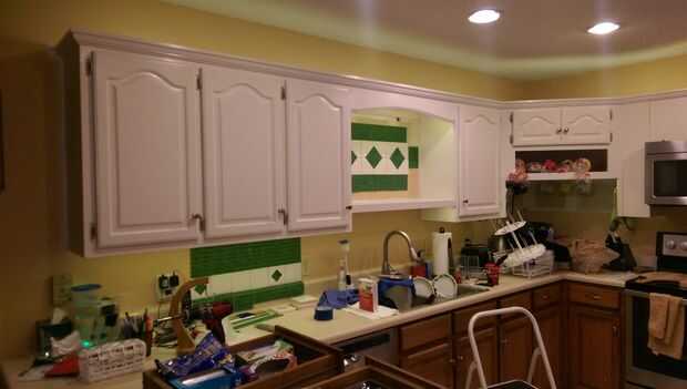 Ahora, este fue mi primer trabajo de azulejo y definitivamente jodido algunas cosas, pero creo que era capaz de ocultar la mayor parte de. Algunas de la lechada líneas eran mucho más amplias de lo que yo quería, en particular cerca de los gabinetes, y debo haber alquilé un azulejo de sierra para cortar algunos de los bordes, pero hizo trabajar. Para el-pro, no se ve bien. Blanco lechada con gabinetes blancos y blanco para calafatear hace ti todos se mezclan muy bien.