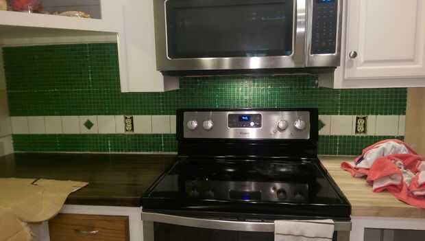 Afortunadamente, contamos con una tienda local que vende materiales de construcción a un precio super barato - sobre acciones de empresas locales o contratistas. La población está en constante cambio, pero nosotros habíamos sido frecuentarlo debido a la renovación, en caso de que nada vino en que nos ha gustado mucho. Nos golpeó el jackpot! Me paso a buscar estos azulejos de vidrio que estaban en la venta de liquidación de $5 por caja. No una hoja, pero una caja (25 plazas por caja). Así conseguí 4 cajas, (demasiados a posteriori) y fue capaz de usarlos en combinación con algunos azulejos blancos normales darle un tablero de aspecto decente. Todo, incluyendo el mortero y la lechada fue aproximadamente $75. Probablemente la mejor compra de todo el proyecto. Que tiene una tienda como nosotros lo hacemos.