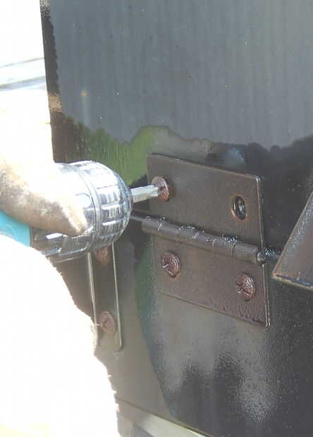 Para quitar la tapa, desenrosque la parte superior de las bisagras en la parte posterior. Mi parrilla tenía los pernos soldados en el interior, así que no necesito llegar alrededor con unos alicates para evitar que gire.