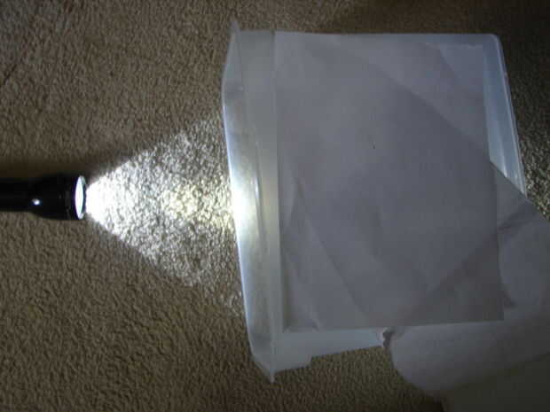 Una vez que Naciones Unidas con cinta inicio mi diseño de la patineta, y usando una caja de luz provisionales (de una linterna y cubo grande) rastrear cada una de las secciones de la cinta de agarre sobre algunos otros pedazos separados de papel, asegurándose de etiquetar cada uno por lo que se sabe que fue en el tablero de adelante hacia atrás, como si yo donde orientado desde la parte trasera mirando hacia el frente. R1 L1 (1 a la izquierda) (derecha 1) L2, R2, L3, R3, ect. Los números más altos cada vez más cerca a la parte posterior. Decidí, a diferencia de la imagen inspiradora, que iba todo el camino de vuelta a la cola con el griptape para mayor agarre y protección de pintura.