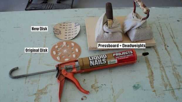Con adhesivo de construcción, ajuste el nuevo disco a los viejos he recogido y guardado para solo este uso. Peso muerto bajo un cartón prensado para cerca de 1/2 hora es suficiente para asegurar la completa adhesión.