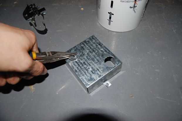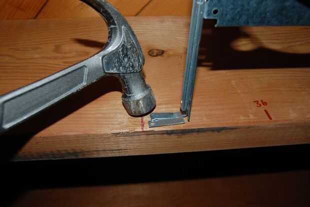 La caja puede tener algunos picos en un lado - este es el lado que va en contra de la yeguada. Línea de la caja de modo que el extremo abierto se pega hacia fuera más allá del borde del perno prisionero de 1/4". Martillo en para que la caja permanece en su lugar propio, entonces hacerlo permanente por conducir unos clavos a través de los orificios en la parte superior e inferior de la caja.