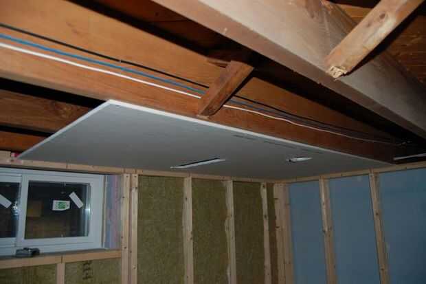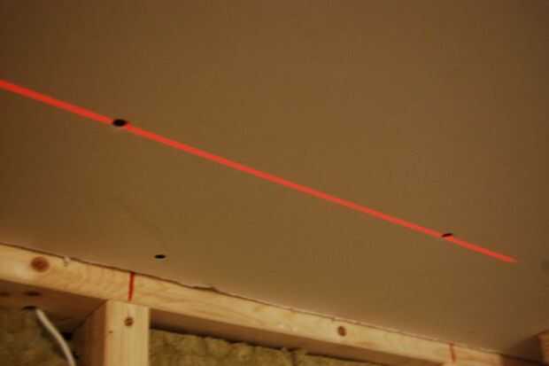 OK, aquí es donde las cosas se ponen interesantes. La manera más fácil y rápida para sujetar una hoja de panel de yeso en el techo es con dos ayudantes. Simplemente coloque el panel de yeso y conducir los tornillos. Incluso puede utilizar la herramienta de línea de láser para atornillar en las vigas "a ciegas" - si la sitúa detrás suficientemente lejos, dibujará una línea en el techo así. Alineados con las vigas a ambos lados de la hoja de panel de yeso y utilizar la línea como guía.