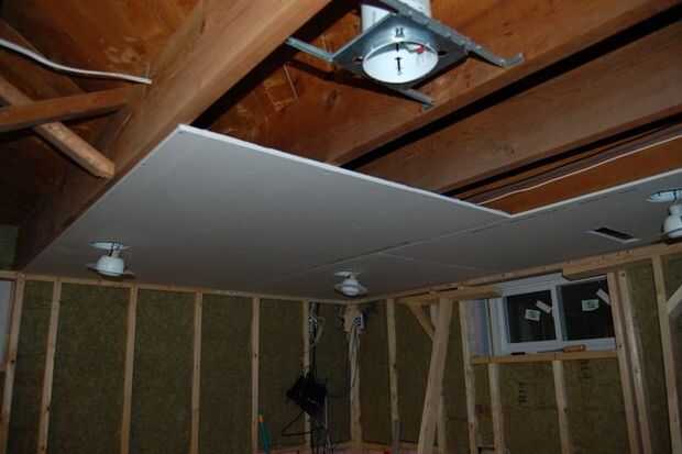 Este proceso es similar a las paredes, con una gran diferencia: para hacerlo más fácil, coloque la hoja boca abajo en el piso y marque dimensiones en la parte posterior de la hoja de panel de yeso en su lugar. Por lo menos, para mí es más fácil imaginar cómo la hoja se ajusta en el techo, simplemente levantándola hacia arriba y en su lugar. Marque la altura y la anchura de la hoja y los agujeros que necesitan ser cortados (decir, para la iluminación).