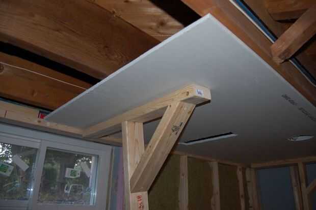 Si trabaja solo o con un ayudante de otro, usted necesitará construir algo que se llama un cuerpo muerto. Es básicamente un soporte en forma de T que es ligeramente más alto que la altura del techo. Se puede hacer con 2x4s de encuadre.