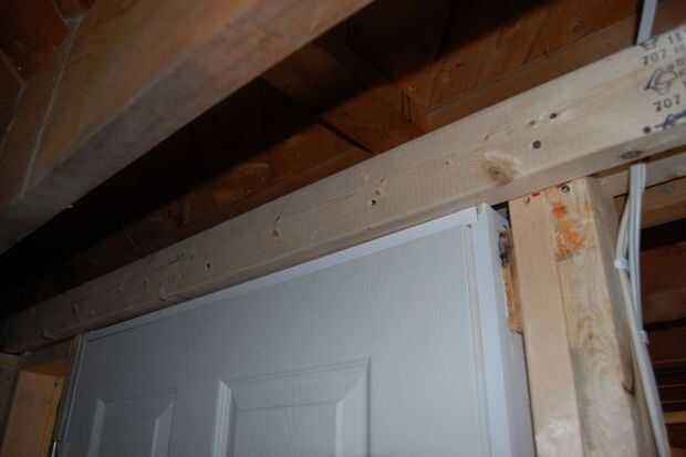 Mida y corte una pieza de 2 x 4 que abarcan el ancho de la abertura y clávelo en su lugar. Clavo otro bloque entre esta pieza y la placa superior, si tienes espacio.