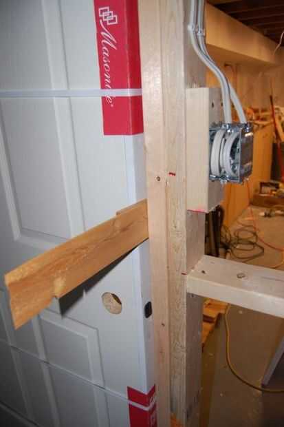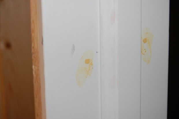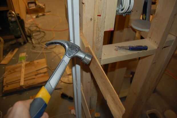 Una vez que esté satisfecho que la puerta esté a escuadra, puede comenzar a clavar en el lugar. Aquí es donde se pone frustrante: muchas de las cuñas se mueven como que está martillando. Sea paciente y esté preparado para reajustar muchas cosas. Uso de 8D acabado de uñas, un clavo recto a través del marco y de la calza y en el perno prisionero en coche. Usar dos clavos por cuña, a cada lado de la puerta. No martillo el clavo en todo el camino todavía, si necesita sacar para hacer una corrección.