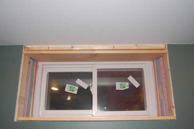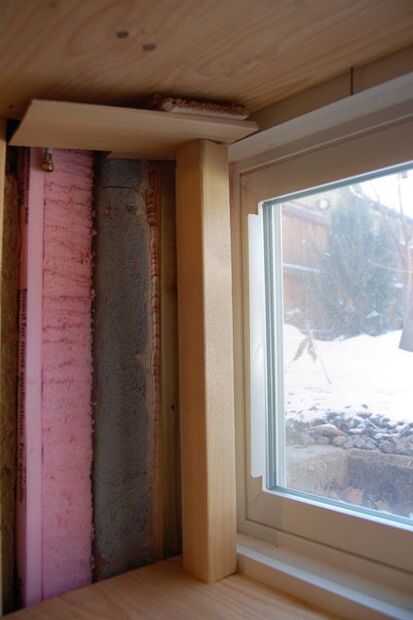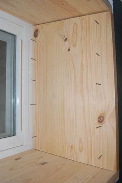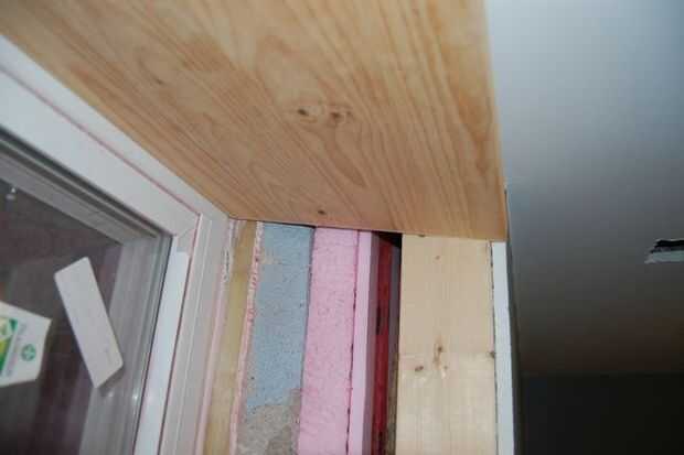 Hacer la parte superior, de manera similar a la parte inferior. Medida para el ajuste, por lo que la junta quede al ras con el marco de la ventana y la pared. En mi caso, con el ángulo en la parte superior, tenía precisamente medir y cortar el borde frente a la habitación de modo que ajuste aplicado a la ventana se sentaba plana. Si estás clavado la pieza de arriba con la mano, es una buena idea poner las uñas en el suelo. Esto hará mucho más fácil colocar la Junta más adelante.