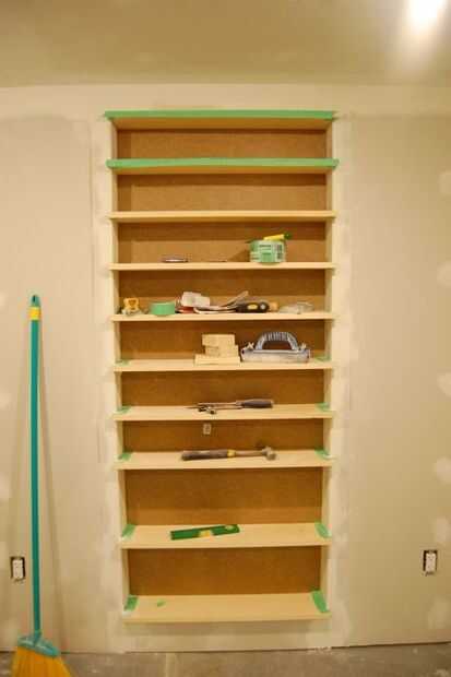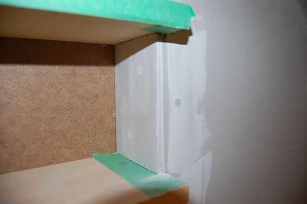 Tableros de yeso hasta los bordes de la plataforma normalmente. Tratar de que el borde acabado de la pared para terminar aquí. Usando trozos de yeso que queda de instalación el resto de la habitación, cortar para caber entre los tableros del estante, con un ajuste apretado de arriba a abajo y llegar a de la pared posterior hasta el borde frontal de la tablarroca montados en las paredes.