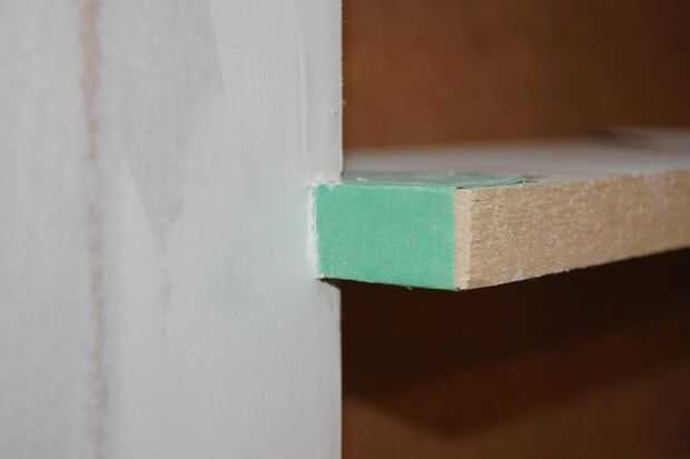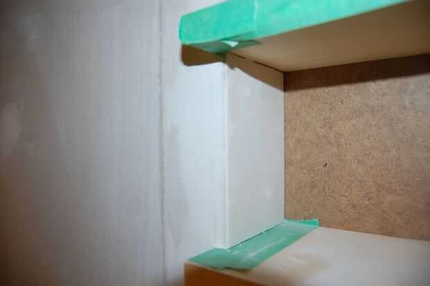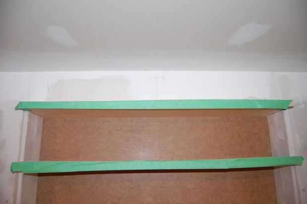 Cada pequeño trozo de yeso del tornillo en su lugar con tornillos drywall o encolar con pegamento de construcción. Probablemente habrá un espacio entre los trozos de yeso donde se reúnen, que tendrá que ser rellenado. Comience con una cinta alrededor de los estantes con cinta de enmascarar. La cinta evitan cualquier mezcla de tablarroca en la madera.