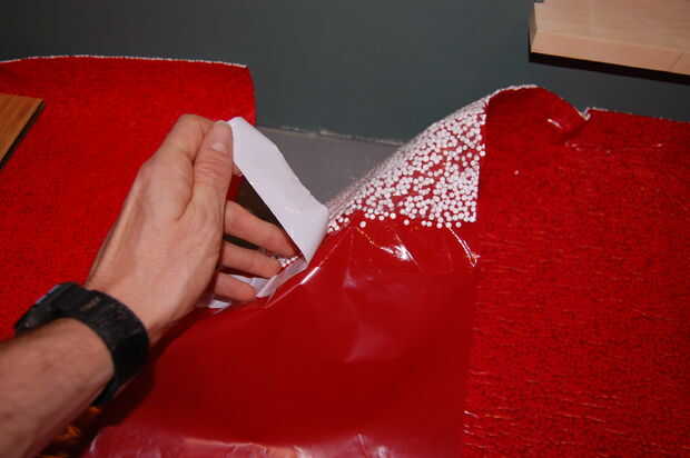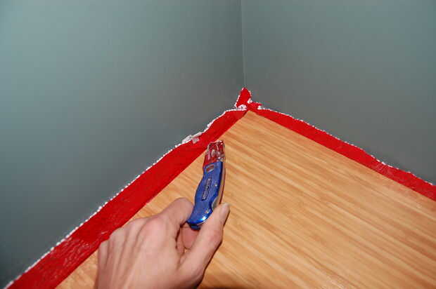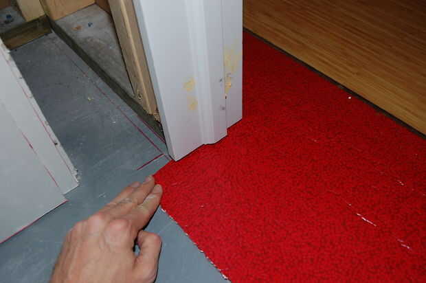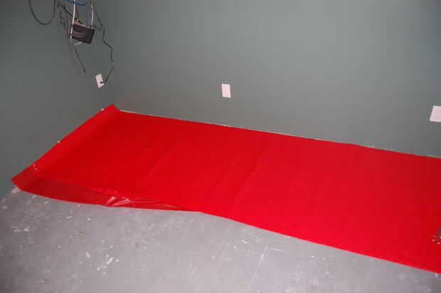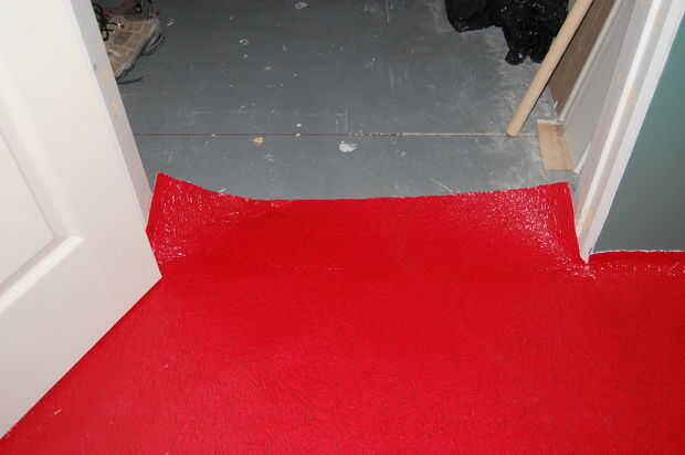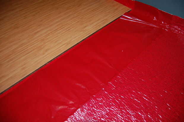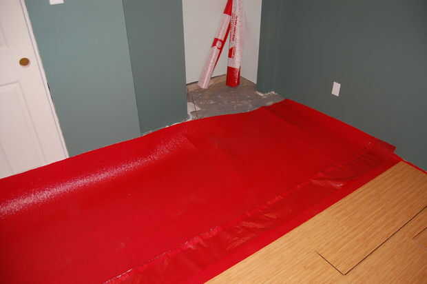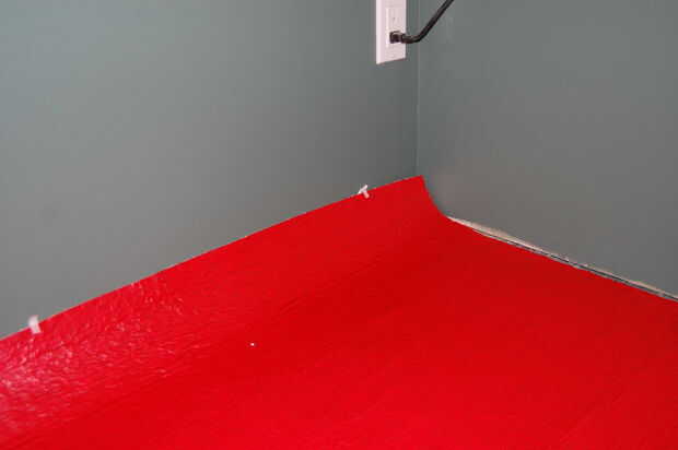 Deben establecerse las piezas de la lámina de soporte hacia fuera sobre el piso, con cerca de dos pulgadas corriendo hasta la pared para que el suelo está completamente envuelto. Después se recortará. Puede colocar todo el piso, o hacer una sección en un momento (como yo).
