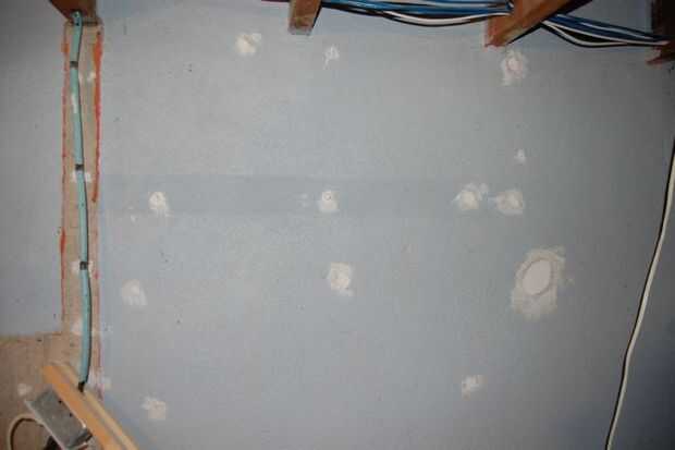 Durante el proceso de demolición, me las arreglé para tirar unos trozos de hormigón de la pared. Esto sucedió donde el dueño anterior había utilizado clavos para concreto para unir las tiras de madera directamente en la pared. El daño a la pared era menor, por lo que había remendada con algún compuesto de reparación de concreto. También había unos agujeros de los tornillos viejos, que yo también.