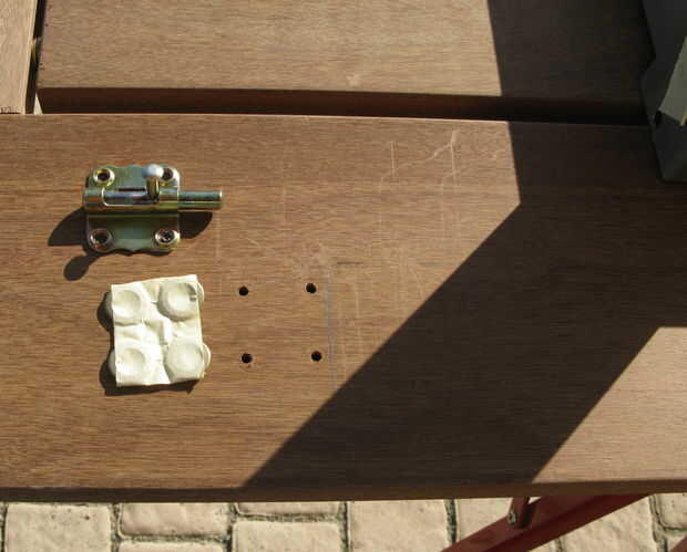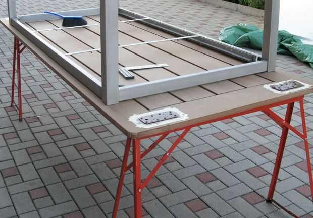 1. Centro de la estructura metálica en la parte superior de la boca abajo y marque las posiciones de pies en la madera con un lápiz.
