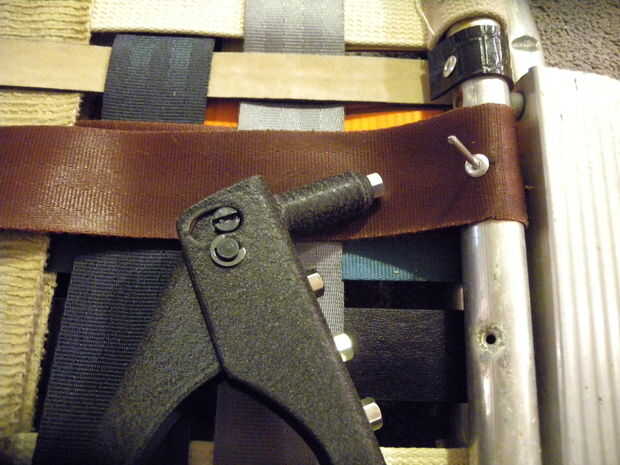 Utilizar un remache del mismo material como el marco para evitar la eventual oxidación (aluminio en este caso).  Utilice la pistola de remache pop para asegurar los extremos de las correas correas de tor desde el punzón lezna o agujero del paso anterior.