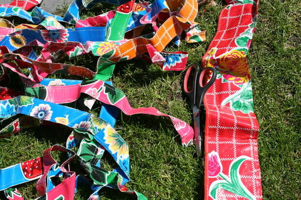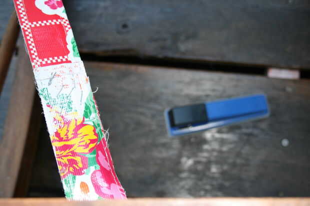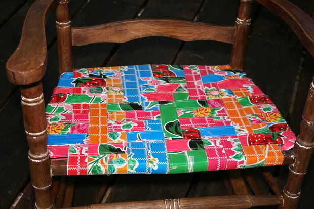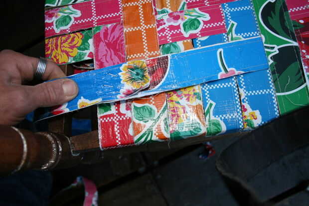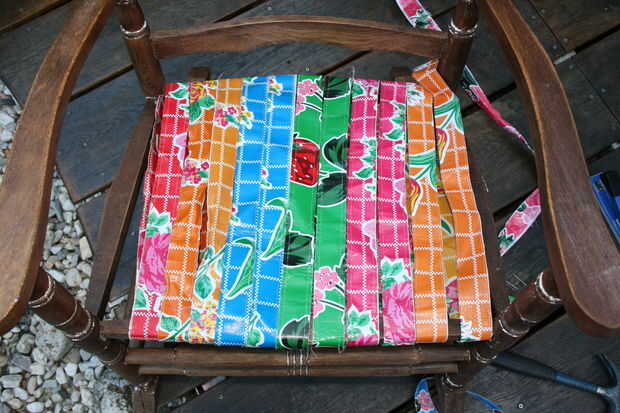 Luego vino la parte difícil; el tejido de un nuevo asiento. Yo contaba con una pantalla de insectos dispuesta e incompleta con un bonito colorido aspecto mantenido para este propósito. Pensé que sería difícil intentar la misma técnica fue utilizada con la fiebre en el viejo asiento. Estaba equivocado, debido a la forma de trapecio de la estructura y el ancho de las cintas que no funcionaban. Lo intenté según algunas instrucciones que se encuentran en algunos libros antiguos tengo (tengo una gran colección de libros instructivos y otras cosas de instrucción) y las instrucciones encontradas internet.