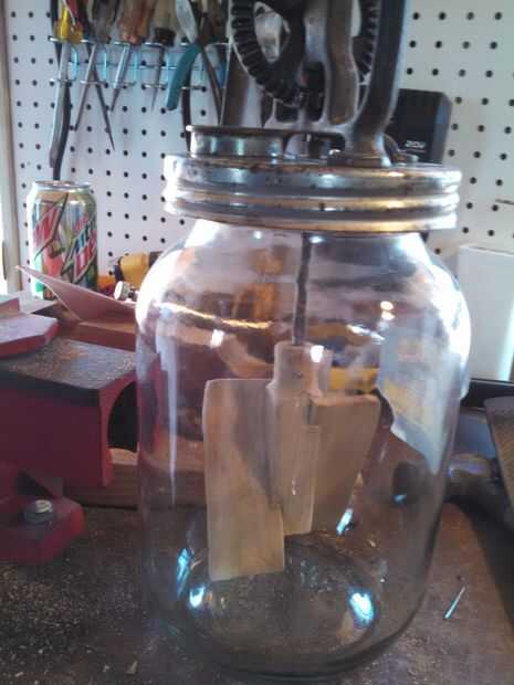 Yo siempre he querido una mantequera antigua mantequilla pero nunca podría justificar el costo. Es bastante fácil de encontrar el conjunto de la paleta de madera, pero casi imposible encontrar una botella de cristal adecuado con el tamaño de apertura. Mi solución fue montar la tapa de 5" de la Dazey mantequera en un frasco de mantequilla de maní de vidrio de 4".