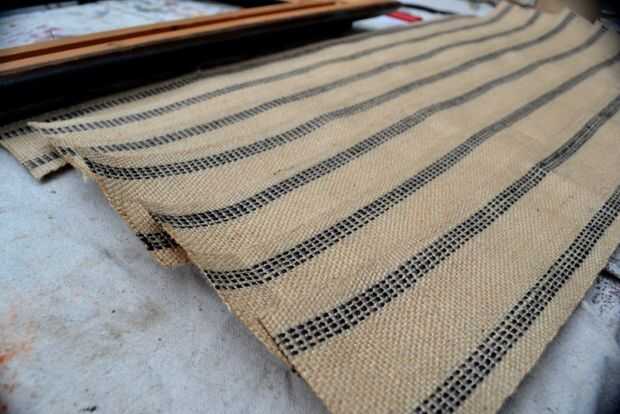 Cortar una serie de tiras de yute que vayan por todo el cartón con un par de pulgadas a de repuesto en cualquier lado para reciclamiento. Usted puede elegir cuánta superposición que desee en las tiras, aquí hemos tenido alrededor de una pulgada. Mayor superposición significa más bolsillos, pero asegúrese de que sigue a encajar en su marco una vez que las tiras se envuelven alrededor de la cartulina.