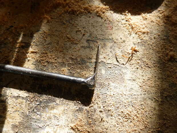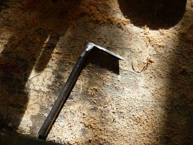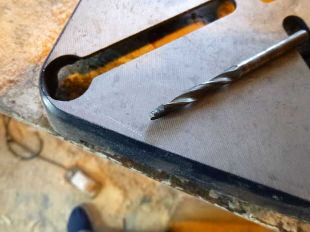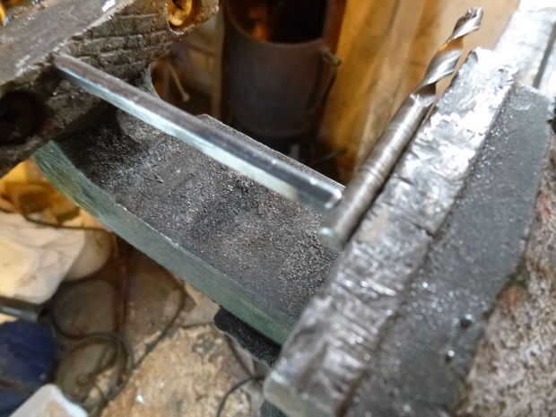 Para reparar el filo, primero he quitado la parte desgastada y entonces utiliza un poco de dril perdido 5 mm. Lo sustitución de la pieza removida soldado. Entonces le di forma con la amoladora, haciendo del filo frontal más ancha que el resto, para reducir la fricción. Cuando sentí que la forma es correcta, hacer un tratamiento de calor elemental, calefacción en la llama del gas y sumergir en agua fría.