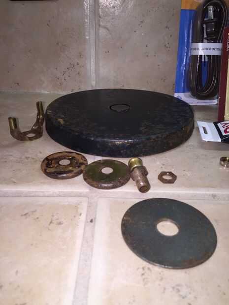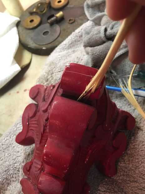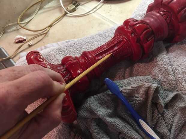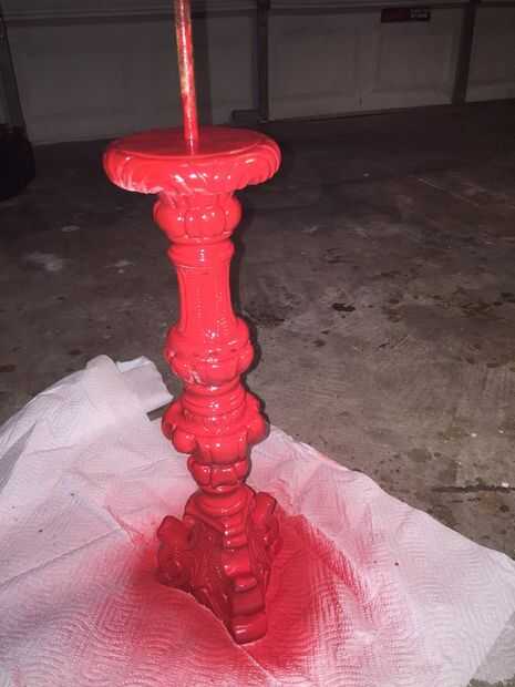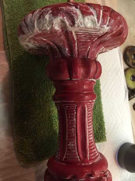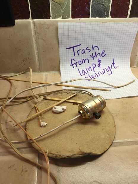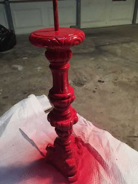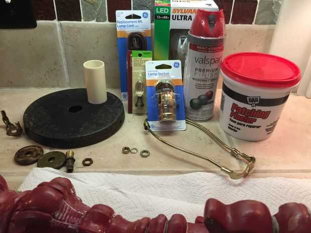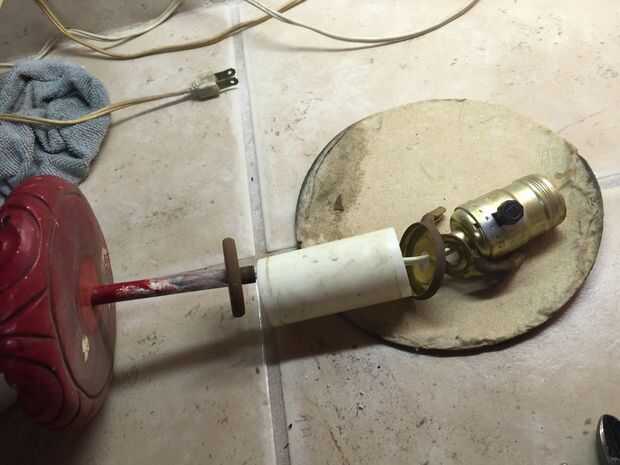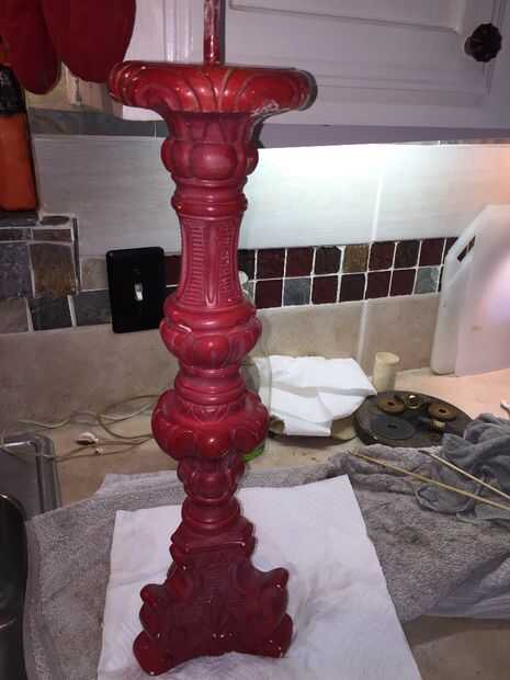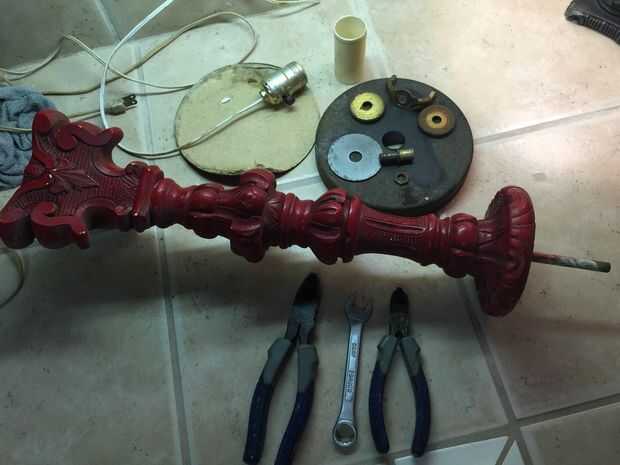 Antes de que pintaba el cuerpo de la lámpara noté marcas pit en el yeso o cerámica del cuerpo de la lámpara. No sé lo que hicieron pero parecía diminutos insectos habían hecho algo a esta lámpara en algún momento en el pasado. He no visto ninguna evidencia de cualquier tipo de actividad de insectos y limpié como locos pero quería esos espacios llenos así que utilicé yeso premezclado como se usaría para reparar una pared de yeso para rellenar los agujeros de la lámpara. Dejo que el yeso seque durante la noche antes de lo pintó. También pinté la base metálica que fue el cuerpo de la lámpara. Yo deje que se seque durante toda la noche y nos dispusimos a poner juntos.