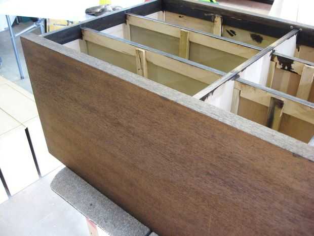 Mancharon los frentes de los cajones todo a pesar de que sabía que sobre todo estaría cubiertos por piezas de señales de tráfico. Esto funcionó bien porque algunas de las piezas de la muestra tenían agujeros en ellos o redondeadas y la madera a la izquierda que muestra a través de ya estaba manchada.