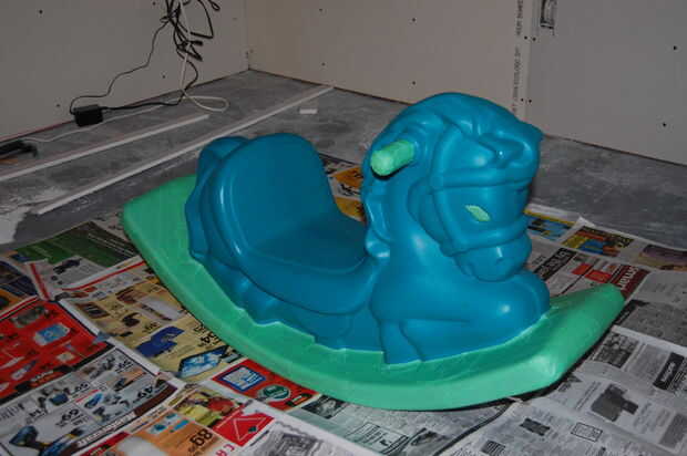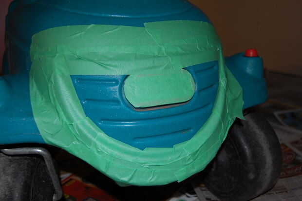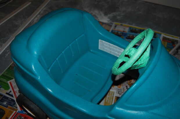 Empecé cubriendo las asas y la base del caballo de oscilación, porque quería que permanecen verdes. Es una buena idea para no pintar las superficies que se frotan en el suelo, en caso de que la pintura se frota. Enmascarado del volante en el coche.