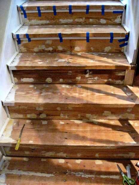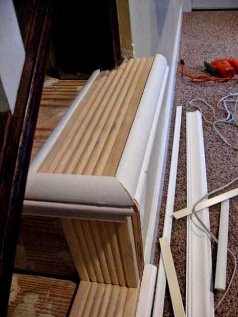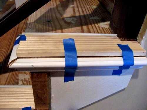 3'' pieza reeded cubierto del enorme orificio en la base de las escaleras. También se hizo para que un acabado bastante fino completar el look nuevo tenía en mente para la escalera. He trabajado mi manera hacia abajo de cada escalera. El cuarto redondo moldeado escondió los huecos a ambos lados de la nariz de la escalera. He utilizado cinta adhesiva para mantener segura todas las piezas juntas mientras el pegamento se secaron.