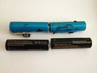 Una vez abierto, nos encontraremos con las baterías. En el mercado, existen multitud de baterías con filtro-regulador de muchas formas y tamaños. A la hora de elegir la batería, hay tener en cuenta varios aspectos. Primero la forma, es de forma de la de la de la aseguraos la misma o de lo contrario quizás no entre o vaya muy holgada (es obvio no?). Segundo y muy importante el voltaje, fijáos en la batería voltaje lleva y buscadlas con el mismo voltaje si os queréis evitar problemas (el voltaje viene especificado con la letra V, en mi caso 3, 7V). Por último el amperaje, en dado de viene MAH y es la capacidad de tendencial tienen las baterías. Aquí si reciben buscar unas Charlotte más miliamperios, así os duraran más, pero tampoco os paséis, no vaya a ser luego haya problemas.